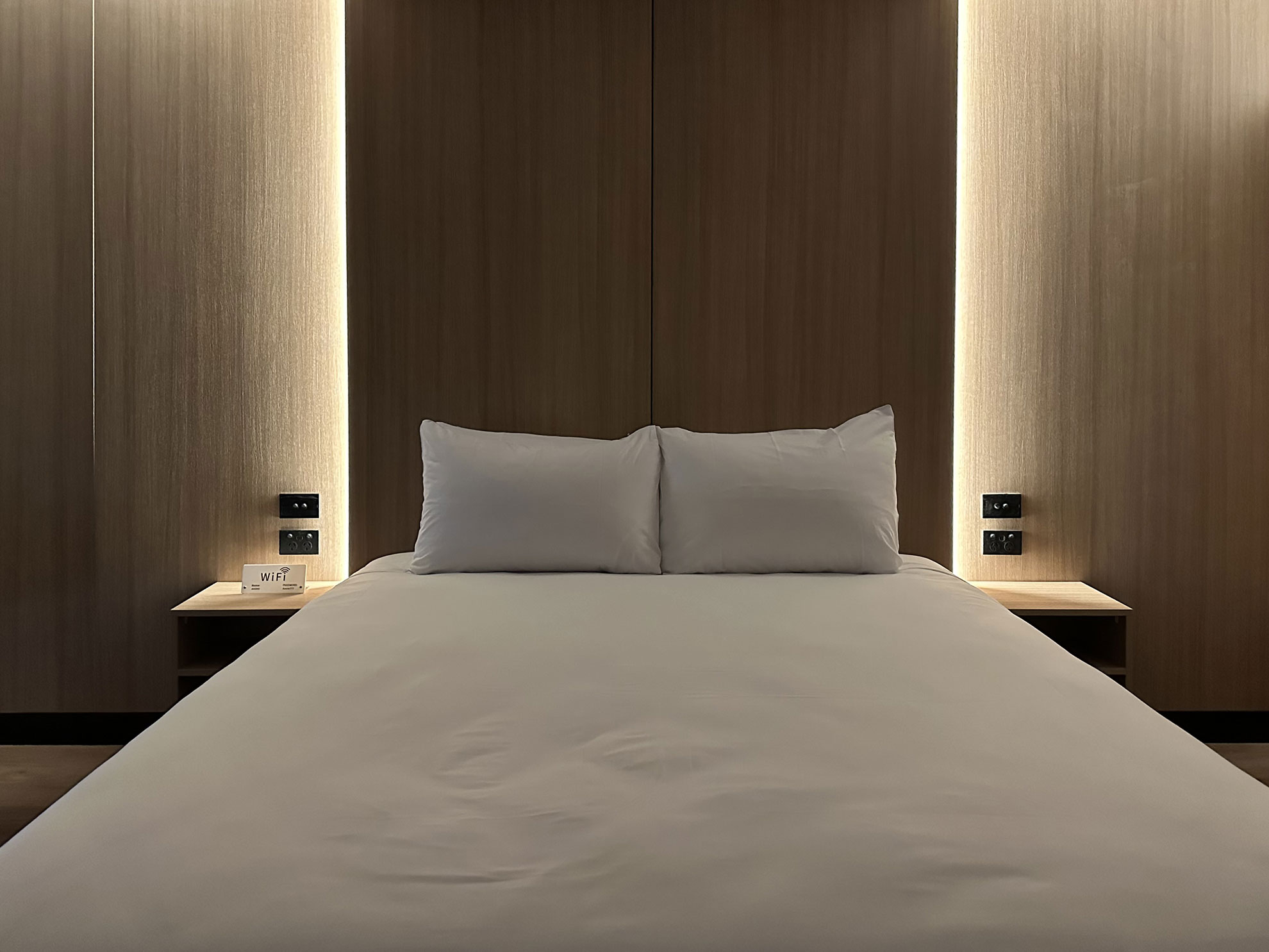 A modern, calming space with a king bed, warm wooden interiors, and a fully equipped kitchen — perfect for a peaceful stay.
